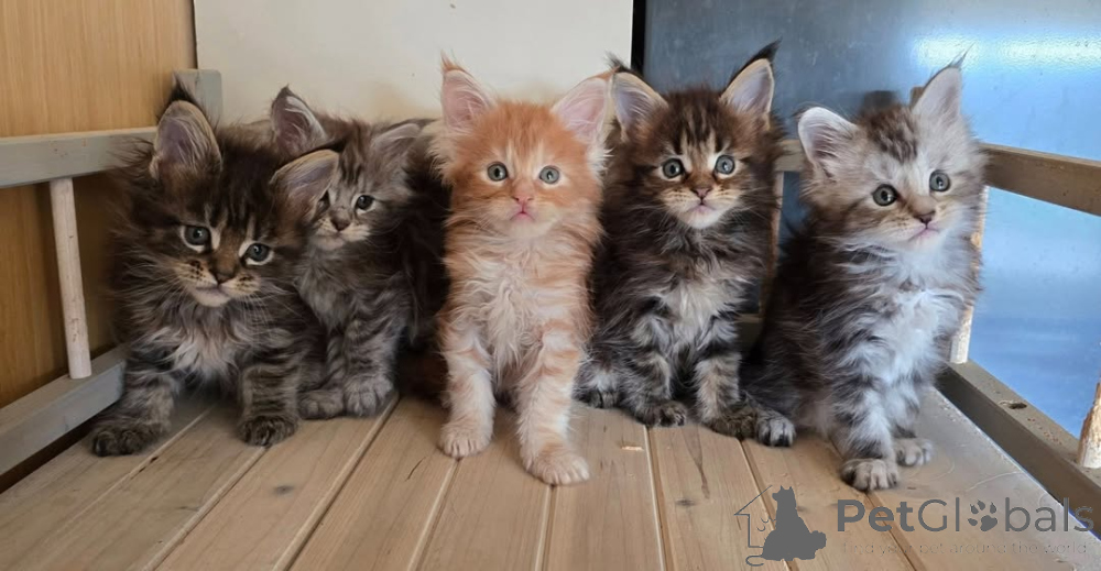 Das Kätzchen hat einen kräftigen Körperbau, ein langes, weiches Fell und das klassische Maine-Coon-Aussehen mit ausdrucksstarken Augen und einem selbstbewussten, liebenswerten Charakter. Es ist verspielt, gesellig und genießt menschliche Zuwendung, ist aber gleichzeitig ruhig und leicht zu handhaben.