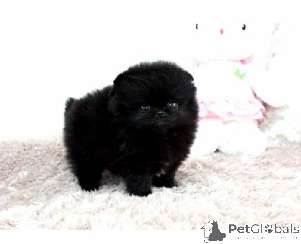 Adorable black Pomeranian puppy is very playful with toys and children at home. She is vaccinated, dewormed, and microchipped and has a blue EU pet passport. She is very friendly and affectionate, and we would love for her to find a loving new home.
