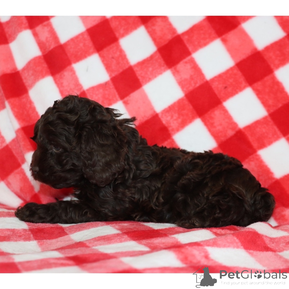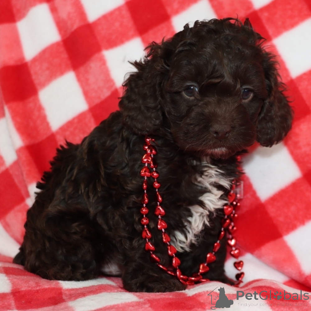 Hi, I'm Cocoa Bear! I'm a 7-week-old male Cockapoo. My dad is a Poodle and my mom is a Cocker Spaniel. I have a beautiful chocolate coat, and I was born on December 14, which makes me a Sagittarius sign. I'll be ready to go home to my forever family after February 11, once I'm grown enough to leave my litter. When I reach my adult size, I should weigh between 9–35 lbs. My paws are ready to pitter-patter through your home and heart.