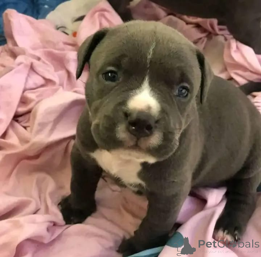 American Pit Bull Blueline is looking for a new home, She is affectionate and very playful. She is currently learning house training, which is going very well. She is treated for fleas, ticks, and other small parasites and has been dewormed. The puppies come with a dog bed, toys, a leash, and two collars one for her current size and one for when she's bigger. She also has food and a water bowl, as well as her toys. She currently lives in a house with a garden and access to a park.