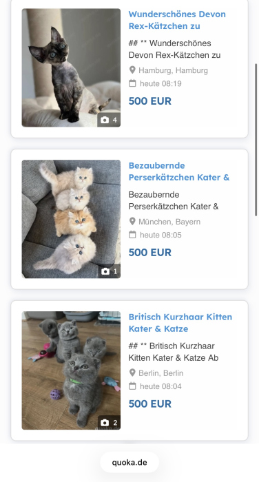 schon alleine bei seinen Anzeigen muss einem auffallen das er ein Betrüger ist! Er hat 92 aktive Annoncen laufen, darunter nur Zuchtjungtiere (Welpen und Kitten) in sämtlichen Städten (Hamburg, München und Berlin, etc...)